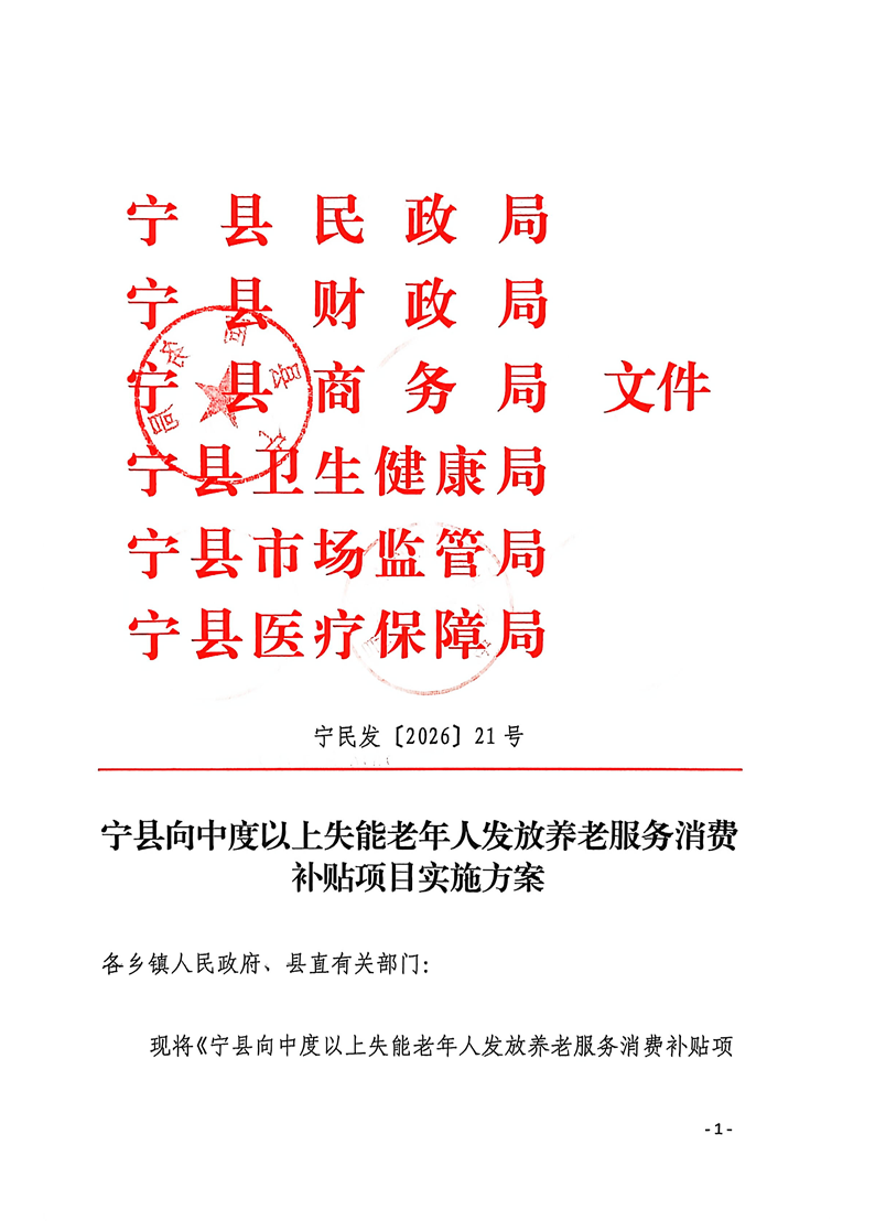 索引号: 621026mzj000/20260328-00012 发布机构: 生效日期: 2026-03-28 废止日期: 文 号: 所属主题: 养老服务 宁县向中度以上失能老年人发放养老服务消费补贴项目实施方案 来源:宁县民政局 发布时间:2026-03-28 浏览次数: 次 【字体:小 大】 【打印正文】 分享到: 【字体:小 大】