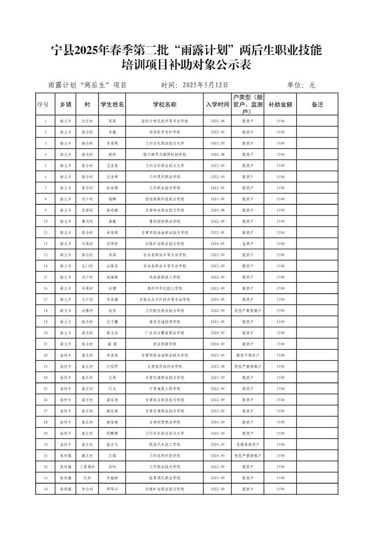 附件:宁县2025年春季第二批“雨露计划”两后生职业技能培训资金补助对象公示表