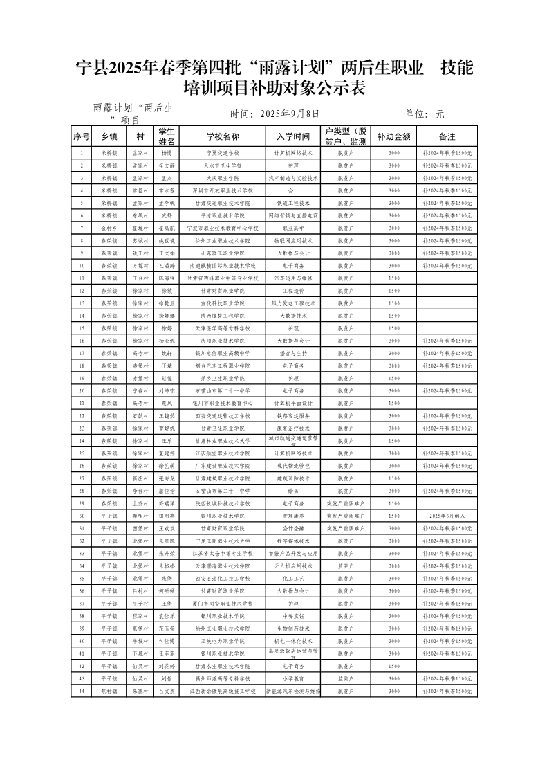 附件:宁县2025年春季第四批“雨露计划”两后生职业技能培训资金补助对象公示表