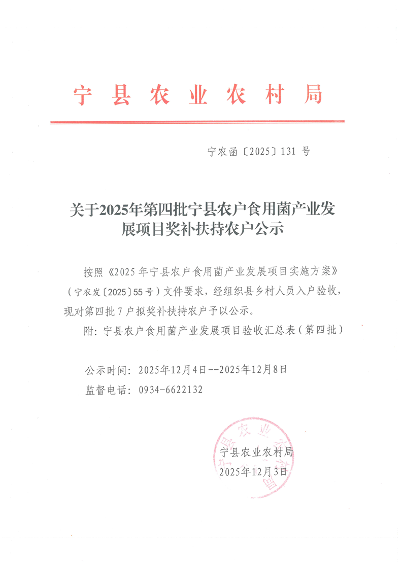 索引号: 621026nyncj000/20251204-00154 发布机构: 宁县农业农村局 生效日期: 2025-12-04 废止日期: 文 号: 宁农函【2025】131号 所属主题: 行政检查 关于2025年第四批宁县农户食用菌产业发展项目奖补扶持农户公示 来源:宁县农业农村局 发布时间:2025-12-04 浏览次数: 次 【字体:小 大】 智能标签: 农户 关于 第四批 宁县 食用菌产业 相关内容 【打印正文】 分享到: 【字体:小 大】