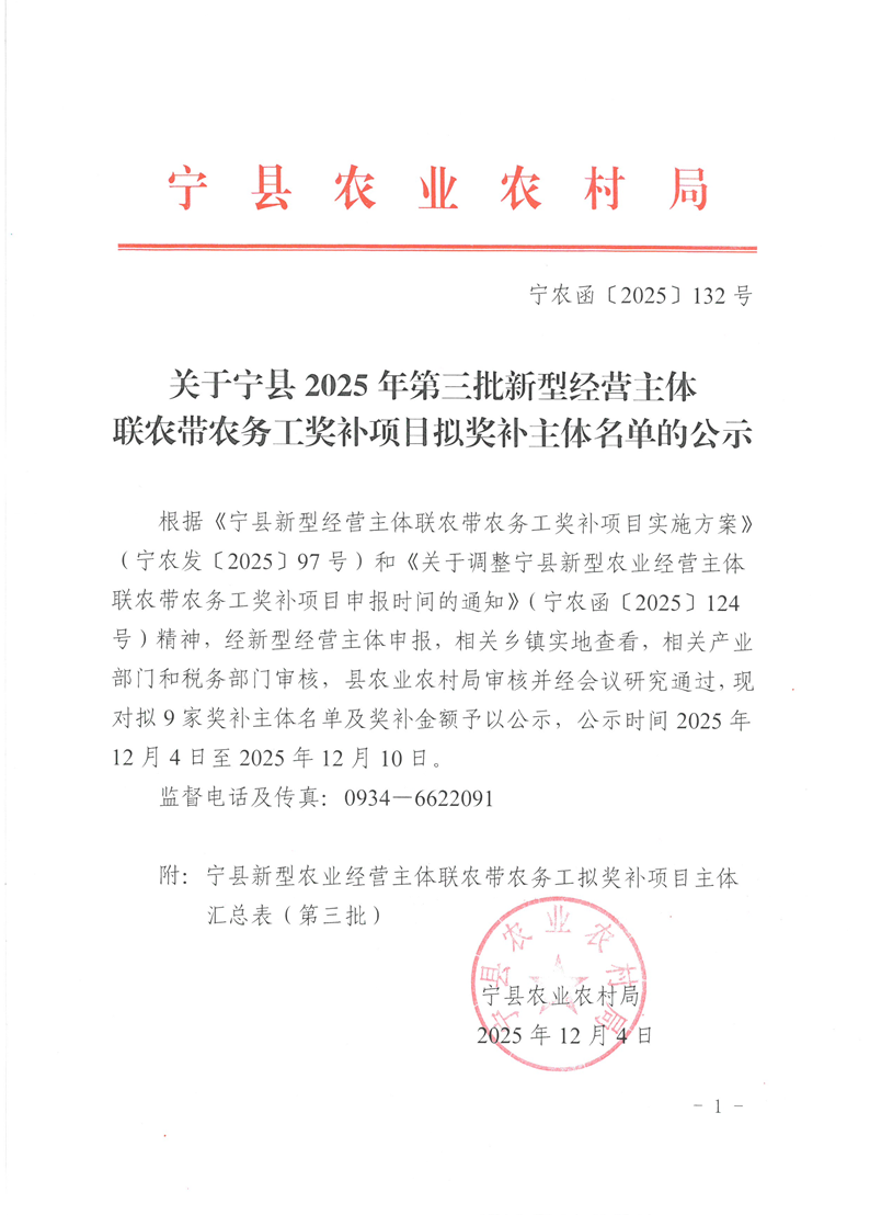 索引号: 621026nyncj000/20251204-00155 发布机构: 宁县农业农村局 生效日期: 2025-12-04 废止日期: 2025-12-10 文 号: 宁农函【2025】132号 所属主题: 行政检查 关于宁县2025年第三批新型经营主体联农带农务工奖补项目拟奖补主体名单的公示 来源:宁县农业农村局 发布时间:2025-12-04 浏览次数: 次 【字体:小 大】 智能标签: 关于 宁县 第三批 新型经营主体 联农带农务工奖补 相关内容 【打印正文】 分享到: 【字体:小 大】