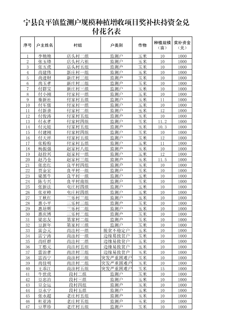 附:2025年宁县“监测户”规模种植增收项目奖补扶资金兑付花名表