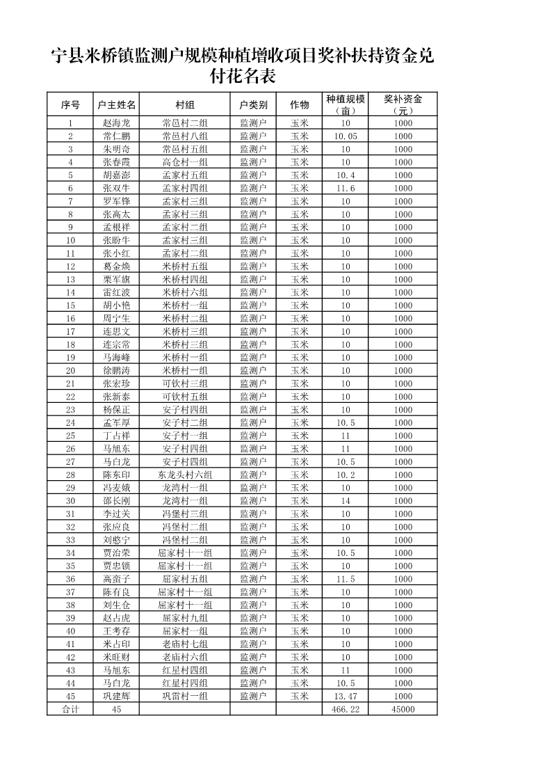 根据宁县农业农村局《关于印发〈2025年宁县“监测户”规模种植增收项目实施方案〉的通知》(宁农发〔2025〕51号)文件精神,对全县规模种植10亩以上粮油等作物的“监测户”(脱贫不稳定户、突发严重困难户、边缘易致贫户)每户补助1000元。县农技中心按照方案要求,组织人员对8个乡镇符合条件的426户“监测户”进行了核查验收,经核实,符合条件的“监测户”共计426户,奖补资金42.6万元。