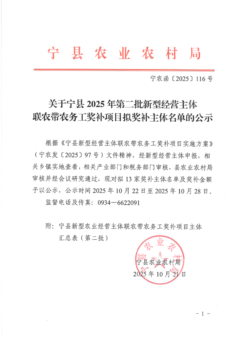 索引号: 621026nyncj000/20251023-00129 发布机构: 生效日期: 2025-10-23 废止日期: 文 号: 所属主题: 乡村振兴 关于宁县2025年第二批新型经营主体联农带农务工奖补项目拟奖补主体名单的公示 来源:宁县农业农村局 发布时间:2025-10-23 浏览次数: 次 【字体:小 大】 【打印正文】 分享到: 【字体:小 大】