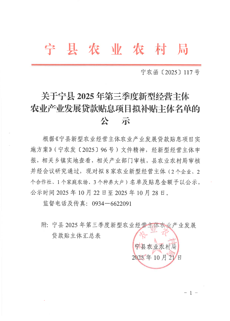 索引号: 621026nyncj000/20251023-00130 发布机构: 生效日期: 2025-10-23 废止日期: 文 号: 所属主题: 乡村振兴 关于宁县2025年第三季度新型经营主体农业产业发展贷款贴息项目拟补贴主体名单的公示 来源: 发布时间:2025-10-23 浏览次数: 次 【字体:小 大】 【打印正文】 分享到: 【字体:小 大】