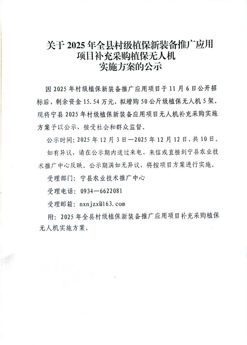 索引号: 621026nyncj000/20251204-00157 发布机构: 农业农村局 生效日期: 2025-12-04 废止日期: 文 号: 宁农发【2025】147号 所属主题: 乡村振兴 关于2025全县村级植保新装备推广应用项目补充采购植保无人机实施方案的公示 来源:宁县农业农村局 发布时间:2025-12-04 浏览次数: 次 【字体:小 大】 智能标签: 关于 全县 村级 植保 装备 相关内容 【打印正文】 分享到: 【字体:小 大】