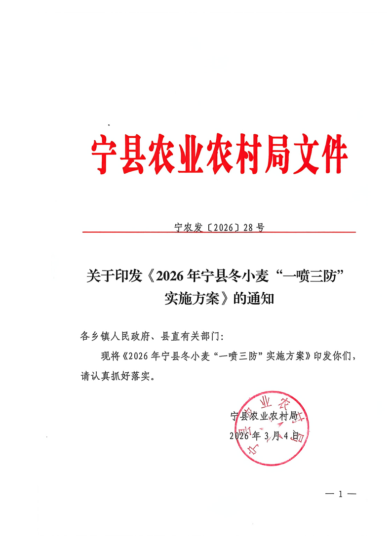 索引号: 621026nyncj000/20260309-00008 发布机构: 宁县农业农村局 生效日期: 2026-03-09 废止日期: 文 号: 宁农发【2026】28号 所属主题: 乡村振兴 关于印发《2026年宁县冬小麦“一喷三防”实施方案》公示 来源: 发布时间:2026-03-09 浏览次数: 次 【字体:小 大】 智能标签: 关于印发 宁县 冬小麦 一喷三防 实施方案 相关内容 【打印正文】 分享到: 【字体:小 大】