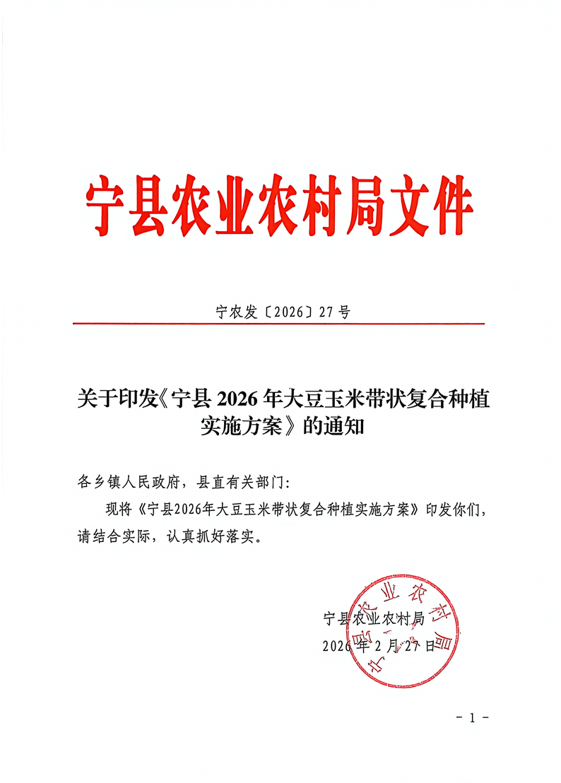 索引号: 621026nyncj000/20260309-00009 发布机构: 生效日期: 2026-03-09 废止日期: 文 号: 宁农发【2026】27号 所属主题: 乡村振兴 关于印发《宁县2026年大豆玉米带状复合种植实施方案》的通知 来源: 发布时间:2026-03-09 浏览次数: 次 【字体:小 大】 智能标签: 关于印发 宁县 大豆玉米 带状 复合 相关内容 【打印正文】 分享到: 【字体:小 大】