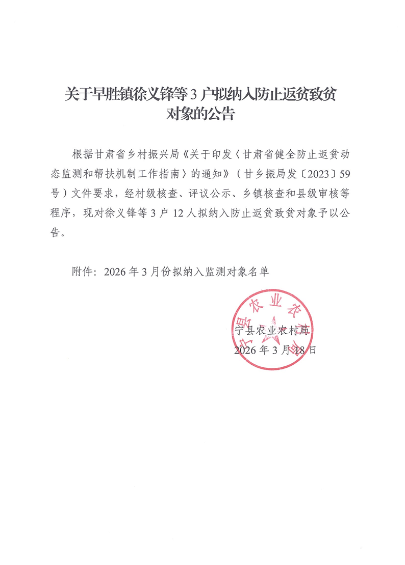 索引号: 621026nyncj000/20260319-00021 发布机构: 生效日期: 2026-03-19 废止日期: 文 号: 所属主题: 乡村振兴 关于3月份3户拟纳入防止返贫致贫监测对象审定结果的通知 来源:宁县农业农村局 发布时间:2026-03-19 浏览次数: 次 【字体:小 大】 【打印正文】 分享到: 【字体:小 大】