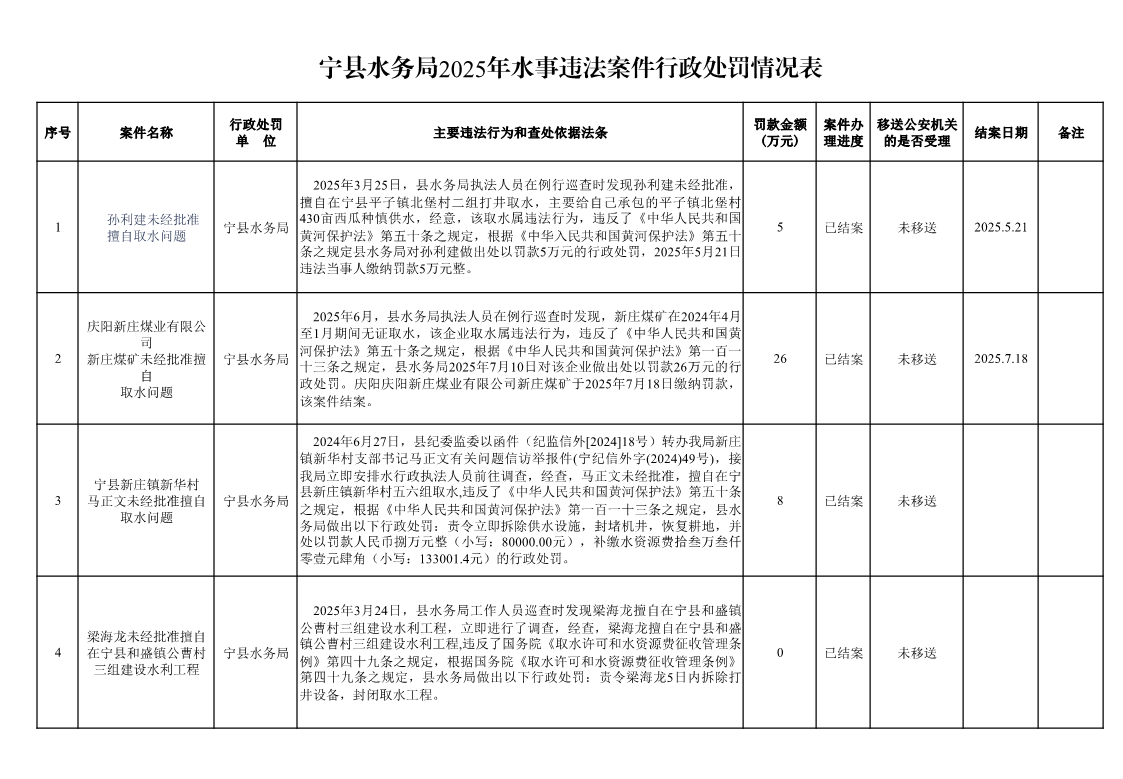 索引号: 621026swj000/20260319-00004 发布机构: 生效日期: 2026-03-19 废止日期: 2027-03-19 文 号: 所属主题: 行政检查 宁县水务局2025年水事违法案件行政处罚情况表 来源:宁县水务局 发布时间:2026-03-19 浏览次数: 次 【字体:小 大】 【打印正文】 分享到: 【字体:小 大】