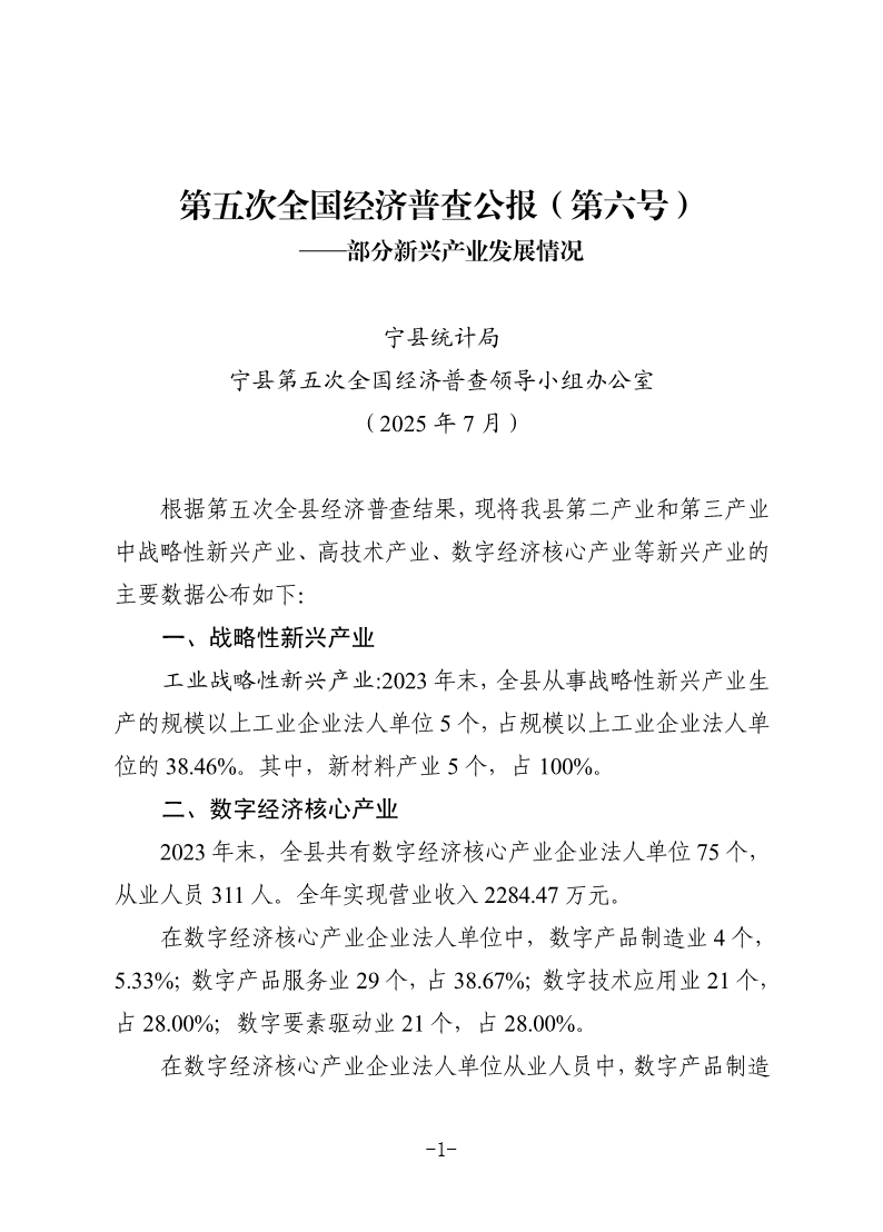 索引号: 621026tjj000/20250901-00013 发布机构: 生效日期: 2025-09-01 废止日期: 文 号: 所属主题: 行政检查 宁县第五次全国经济普查公报6 来源: 发布时间:2025-09-01 浏览次数: 次 【字体:小 大】 【打印正文】 分享到: 【字体:小 大】
