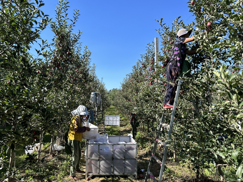据园区负责人郭起龙介绍:“现在采摘的品种叫红思尼克嘎啦,大概在8月10日到8月20日成熟,它的特点是抗病能力强,易上色、可以达到全红,口感松脆细嫩爽脆可口,汁多肉厚。常温下普遍储存可以达到20天左右不发绵。”