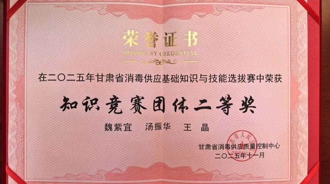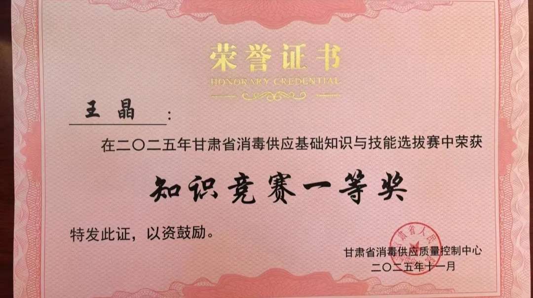 近日,甘肃省消毒供应质量控制中心举办了“2025年甘肃省消毒供应基础知识与技能选拔赛”,宁县第二人民医院消毒供应室护士长王晶在比赛中荣获个人“知识竞赛一等奖”,同时助力团队获得“知识竞赛团体二等奖”。
