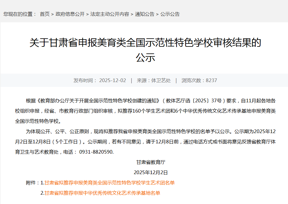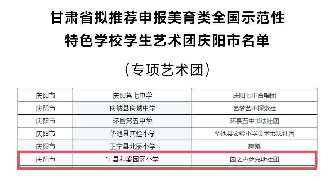宁县和盛园区小学入选全国示范性特色学校拟推荐名单 来源:宁县融媒 作者: 发布时间:2025-12-04 16:29:19 浏览次数: 次 【字体:小 大】 (全媒体记者 屈超)近日,记者从甘肃省教育厅官方网站了解到,甘肃省拟推荐160个学生艺术团和6个中华优秀传统文化艺术传承基地申报美育类全国示范性特色学校,我县和盛园区小学园之声萨克斯社团入选专项艺术团类别推荐名单。 打印正文