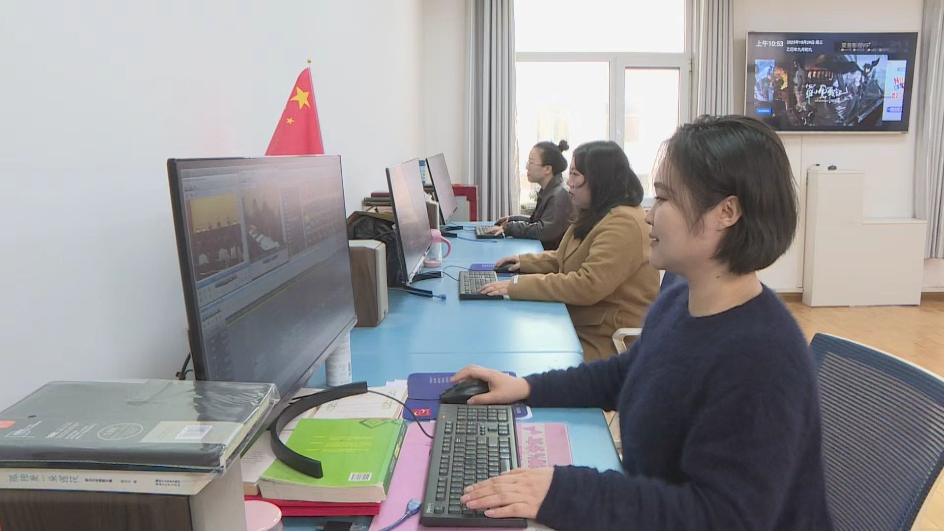 如果说记者是“冲锋在前线的将士”,那么制作编辑就是坚守在后方的“工匠”。在融媒体中心制作编辑室,屏幕上实时滚动着各类采访素材,编辑们正紧张有序地对记者采回来的素材进行筛选、剪辑、排版。