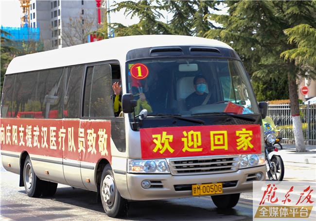 早上6时30分,4名队员乘坐我市迎接车辆从兰州饭店出发。14时40分许,车队驶出庆阳南高速收费站。在13辆警务摩托车和3辆警车开道护送下,车队进入市区,沿石油西路—彩虹桥—岐黄大道—弘化西路—马莲河大道—庆州西路缓缓向前行驶。途中,出租车、公交车、私家车等行驶车辆自发鸣笛,警务人员向医疗队队员敬礼致意,市民自发聚集在道路两侧,拉着写有“抗疫英雄、欢迎回家”“热烈欢迎白衣卫士凯旋”等字样的横幅夹道欢迎,用“欢迎英雄回家”的欢呼声和热烈掌声表达对支援湖北医疗队队员的敬意和祝福。