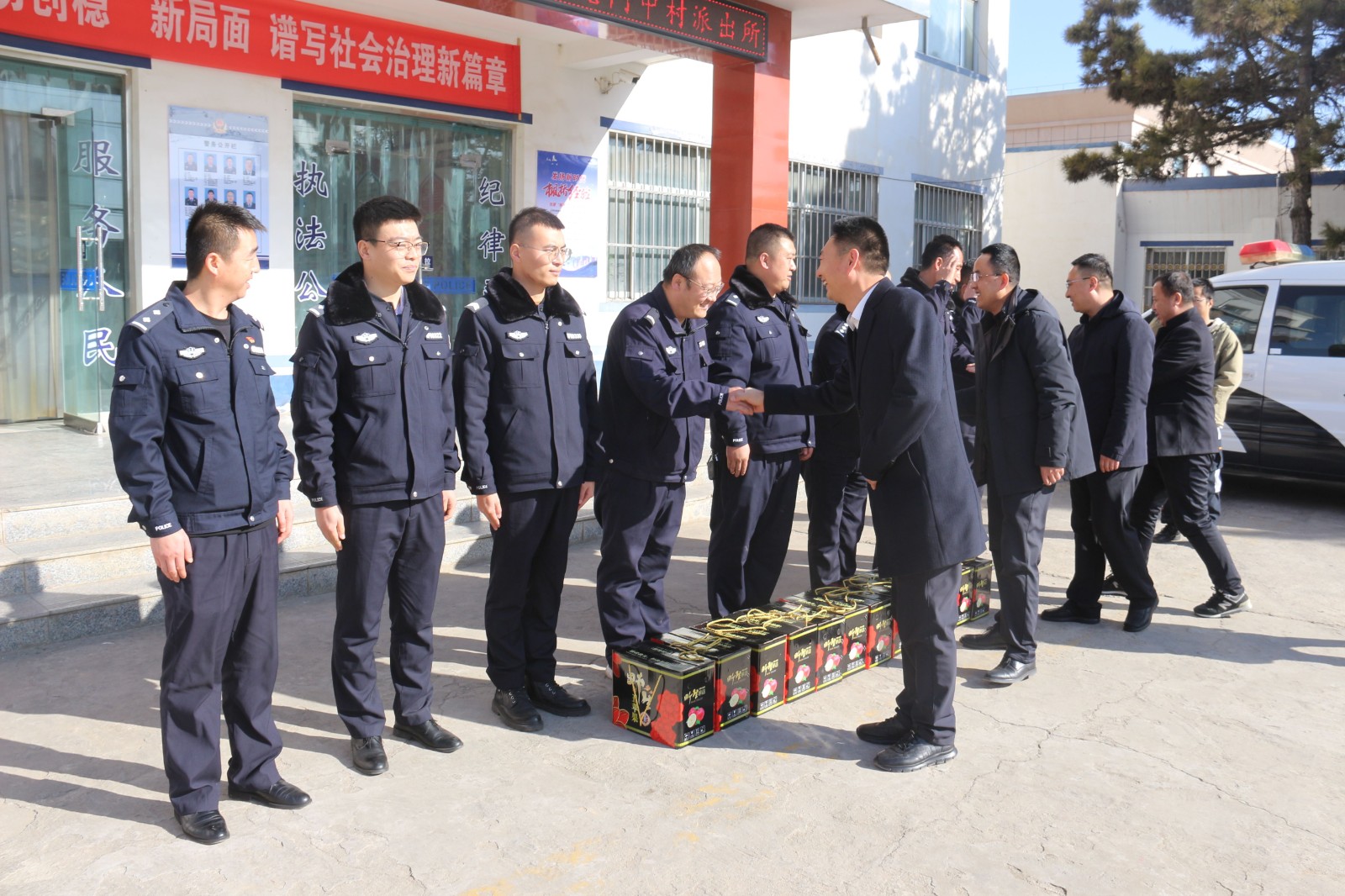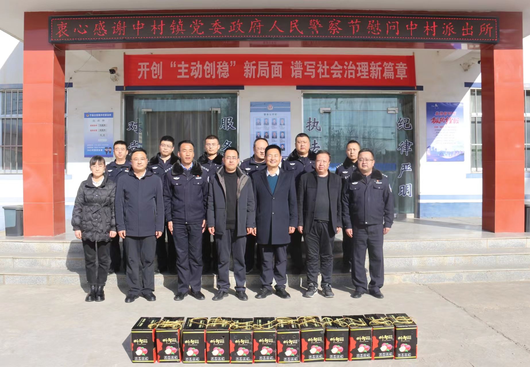 1月10日,在第四个中国人民警察节之际,中村镇党委、政府主要负责人一行到中村派出所开展警察节慰问活动,为他们送上慰问品并向大家致以节日的问候和祝福。