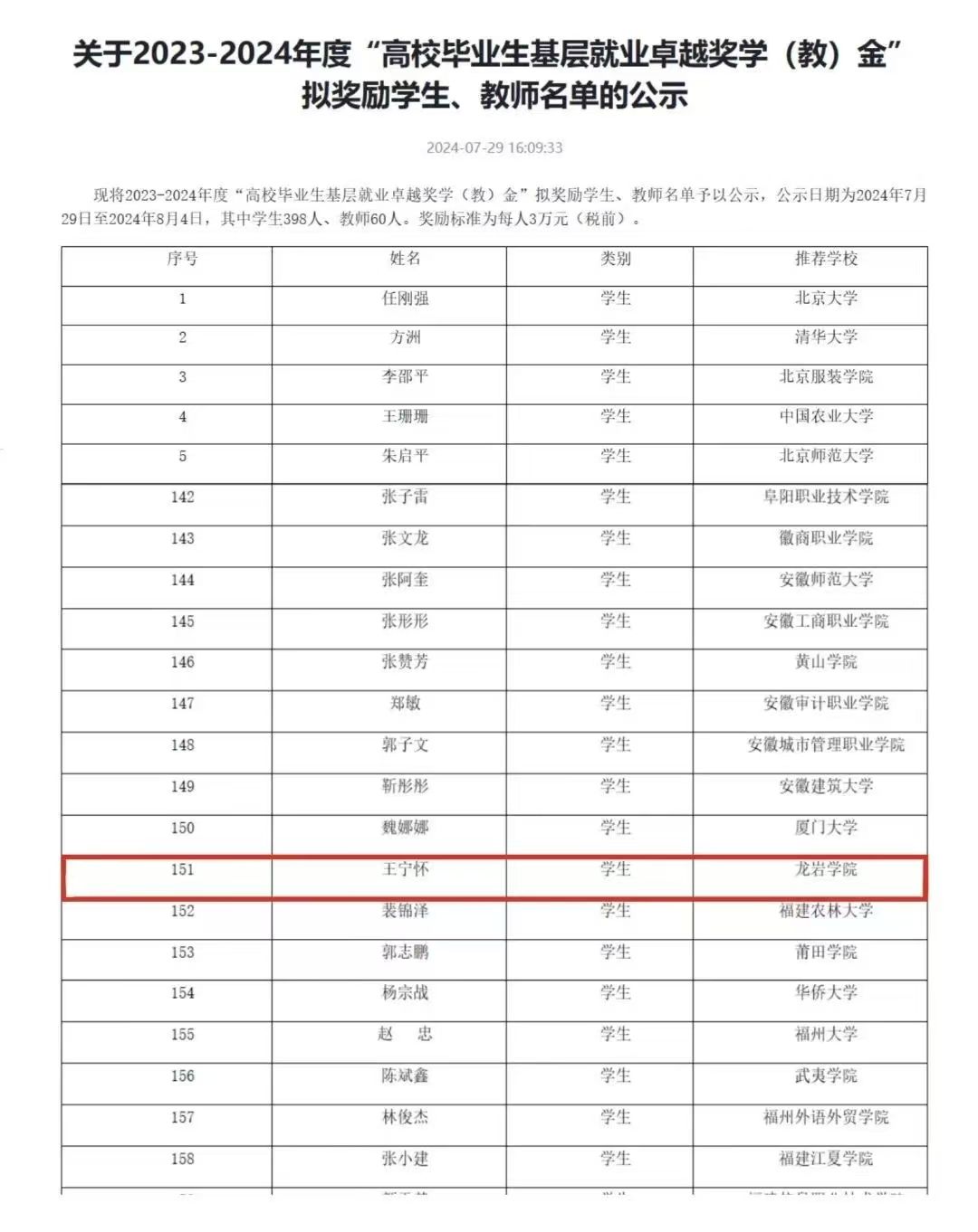 据了解,“高校毕业生基层就业卓越奖学(教)金”由教育部高校学生司、教育部学生服务与素质发展中心共同指导,旨在引导和鼓励高校毕业生到基层就业,对赴基层就业并做出突出业绩的普通高校毕业生和普通高校指导服务大学生赴基层就业工作有突出贡献的教师进行奖励,每年评选一次。