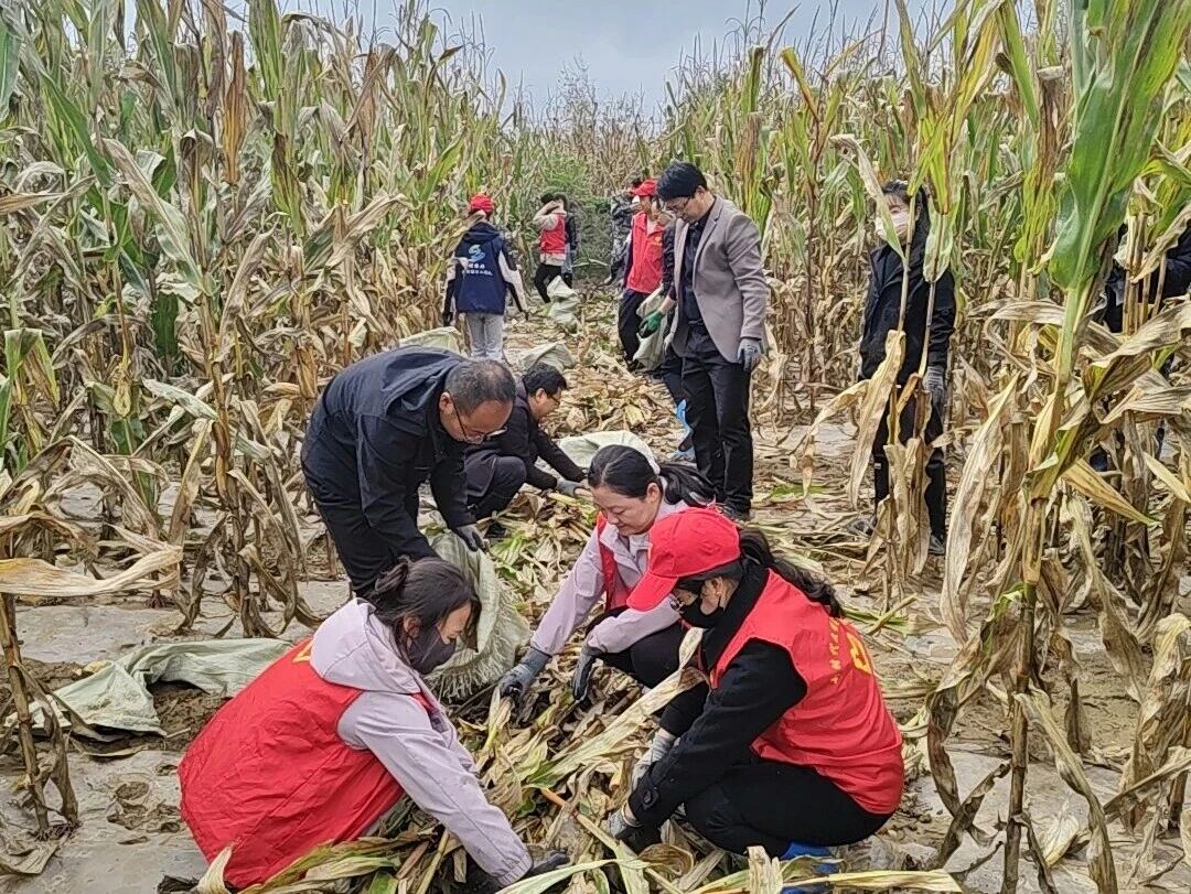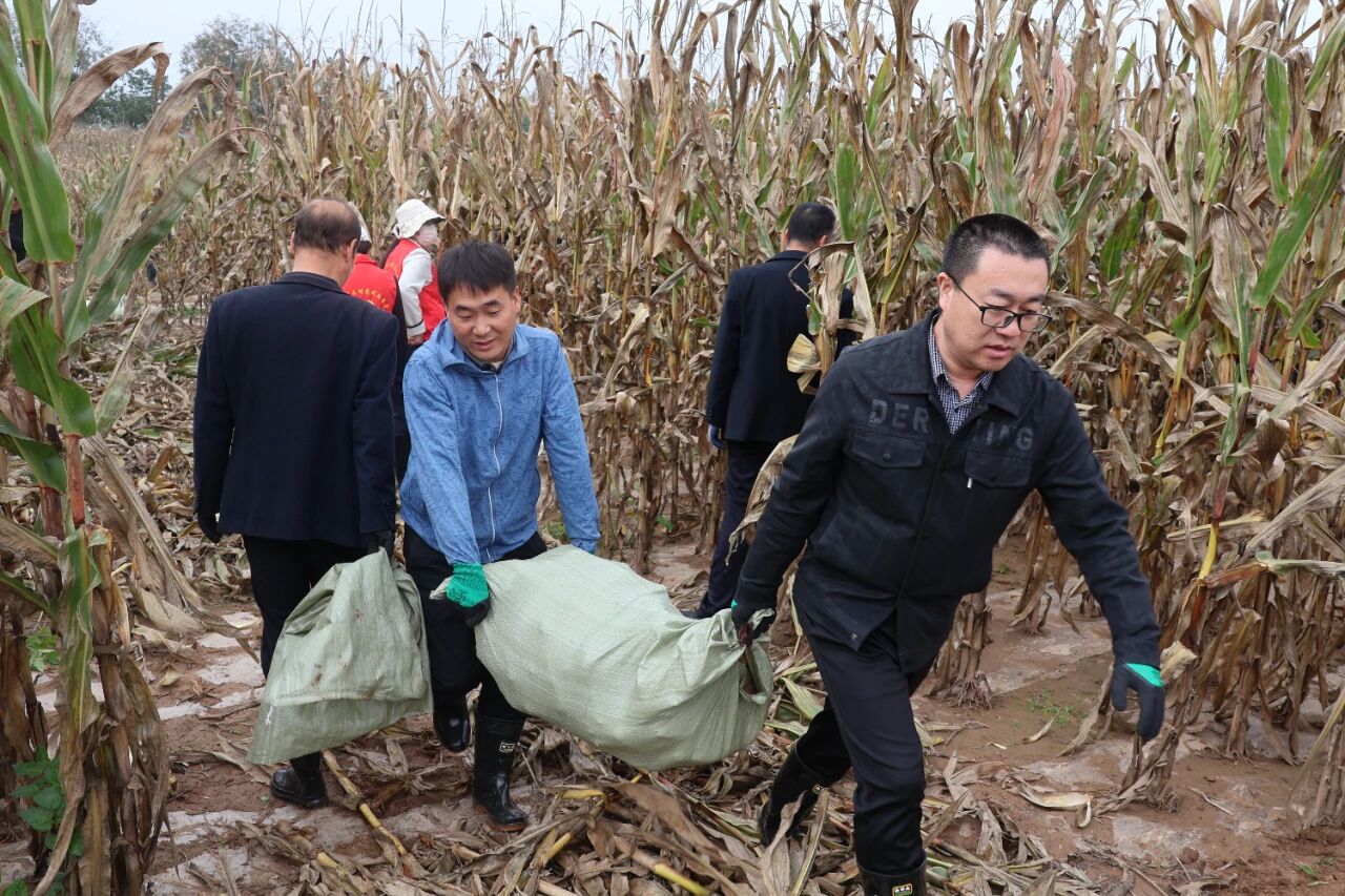 抢收现场,干部们俯身弯腰、埋头苦干,穿梭于玉米秆之间,熟练地将一穗穗玉米掰下、装袋。大家两人一组、三人一队,掰穗、传递、装袋流程井然有序,田间地头回荡着忙碌的脚步声与交谈声,勾勒出一幅干群同心、合力抢收的生动画面。一农户感动地说道:“这块地面积大,家里劳力不足,多亏你们来帮忙,不然真不知道要收到什么时候!”