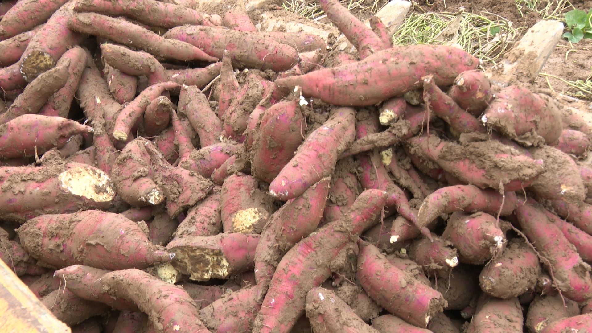 干群配合默契,分拣、装袋、运输……各项工作在泥泞中有序进行,很快,成筐饱满的红薯便堆满了田埂。