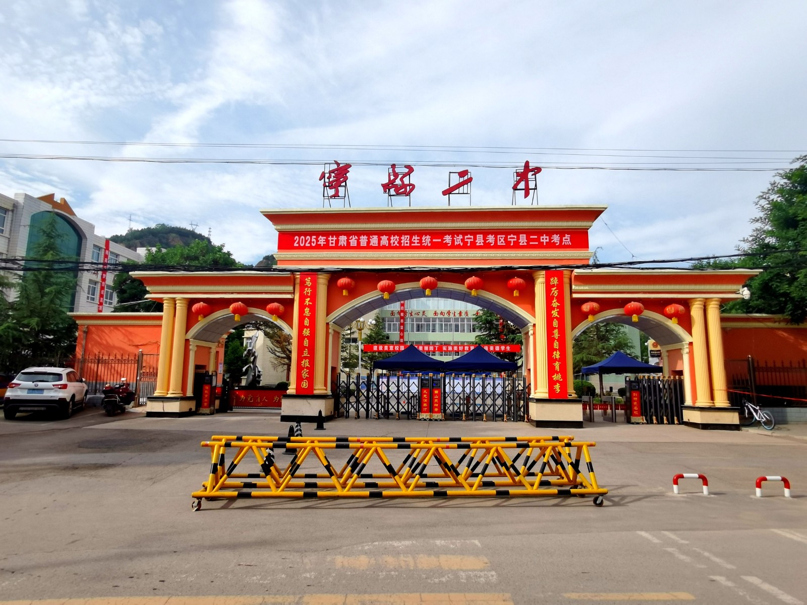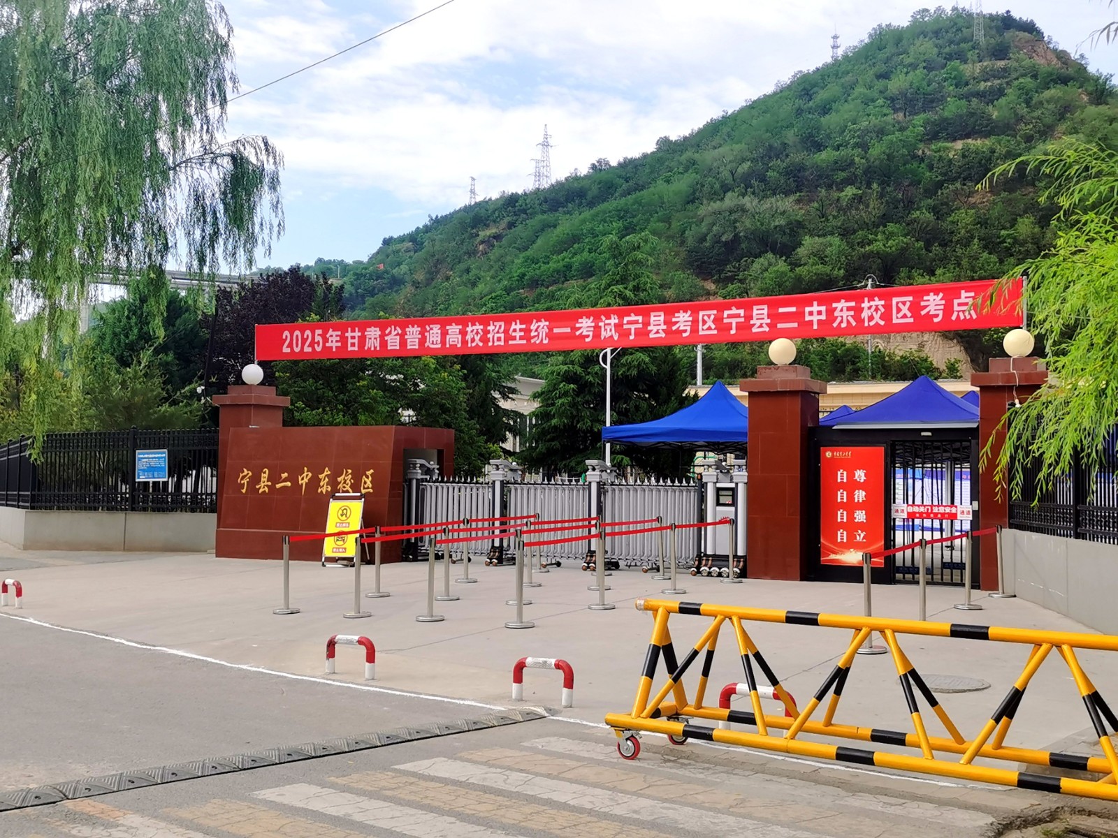 6月6日,宁县二中东校区考点,校门内遮阳棚、考生通道、智能安检设备已就绪