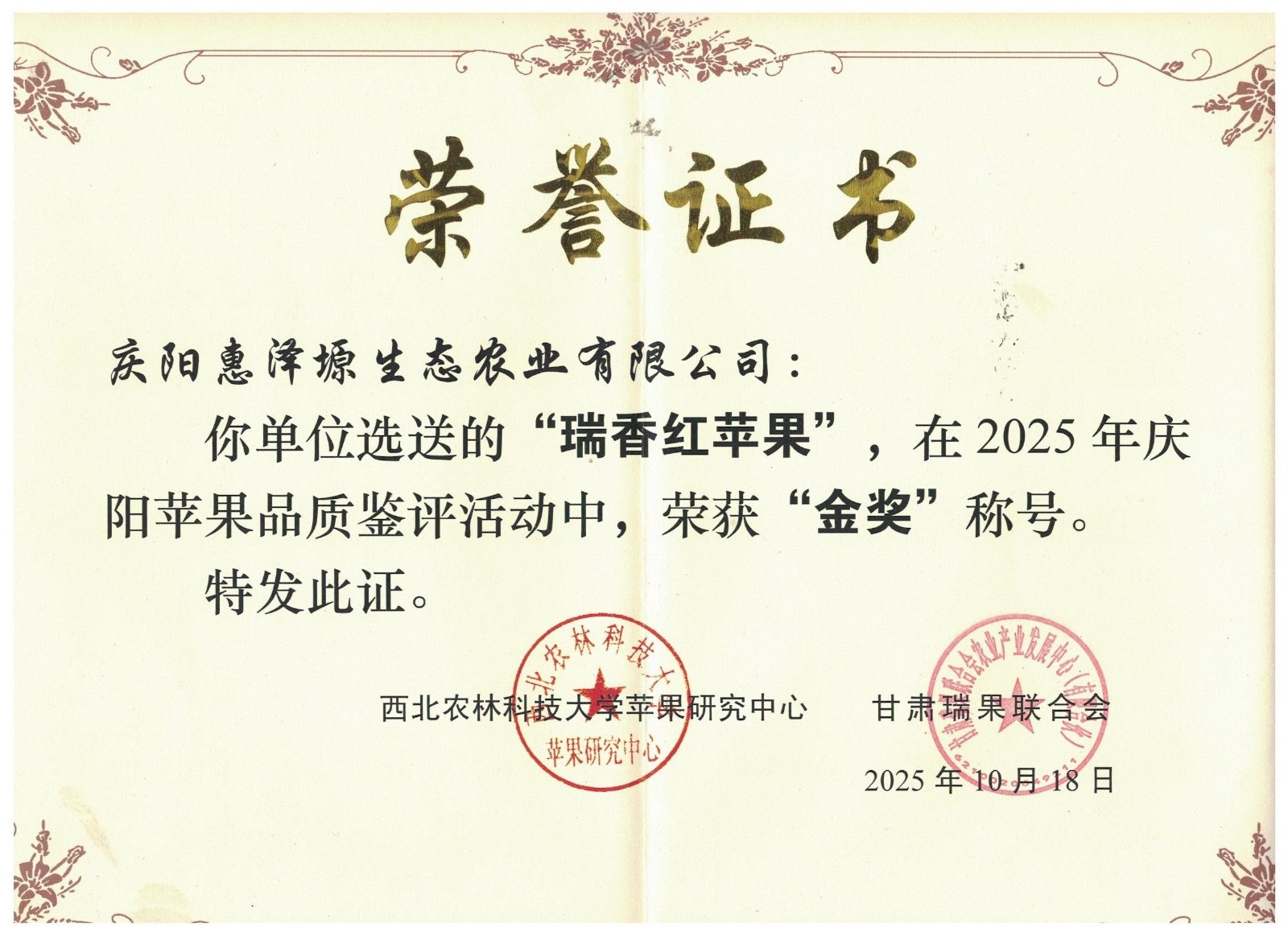 身披绶带、胸戴大红花,刚刚捧回金奖的宁县苹果产业协会会长、庆阳慧泽塬生态农业有限公司董事长李宏江激动地说:“我们种植的瑞香红能在2025中国苹果年会上荣获金奖,我深感荣幸。在这片黄土层最厚的地方,我们培育出了最好吃的苹果。希望瑞香红能带领宁县苹果走向世界,走向更远的地方。”