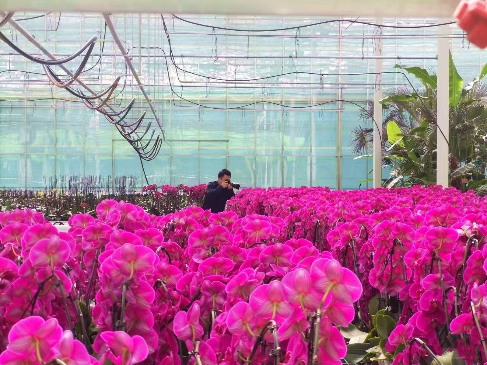 游客在九龙村智慧创业示范园拍摄蝴蝶兰