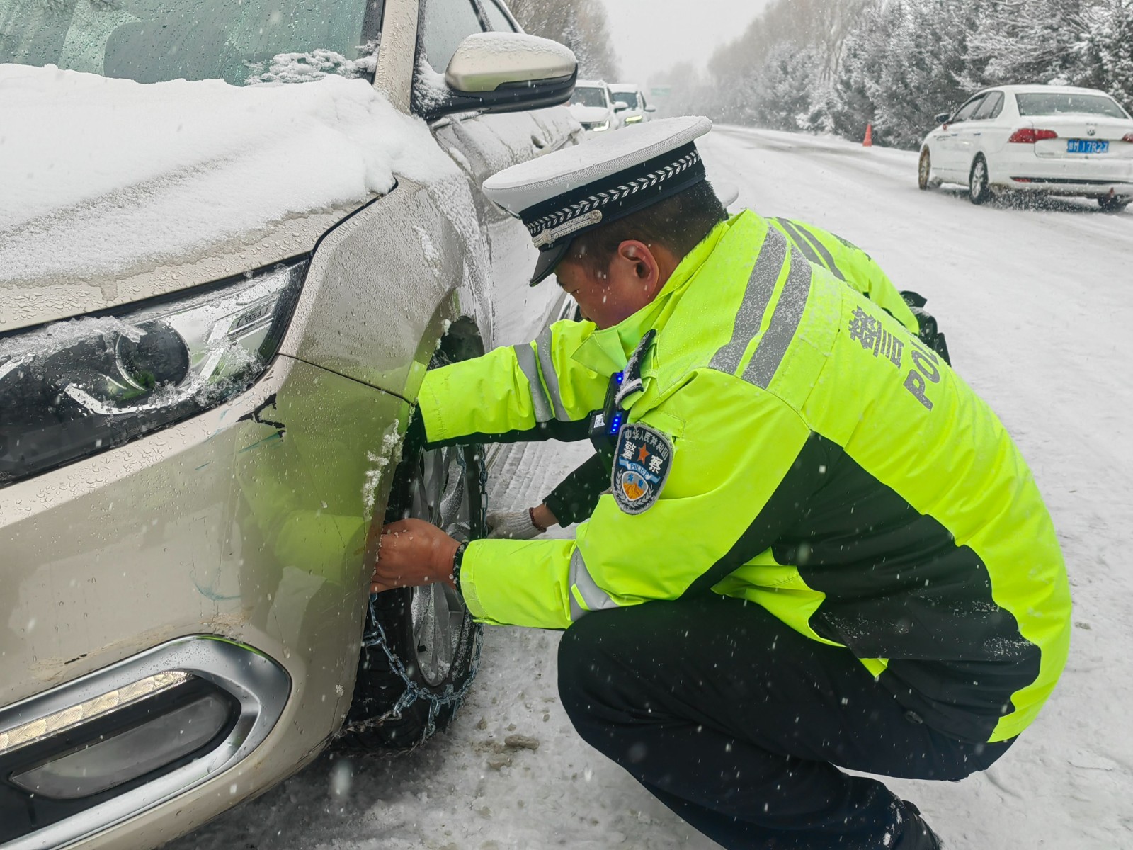 宁县交警帮助过往车辆安装防滑链