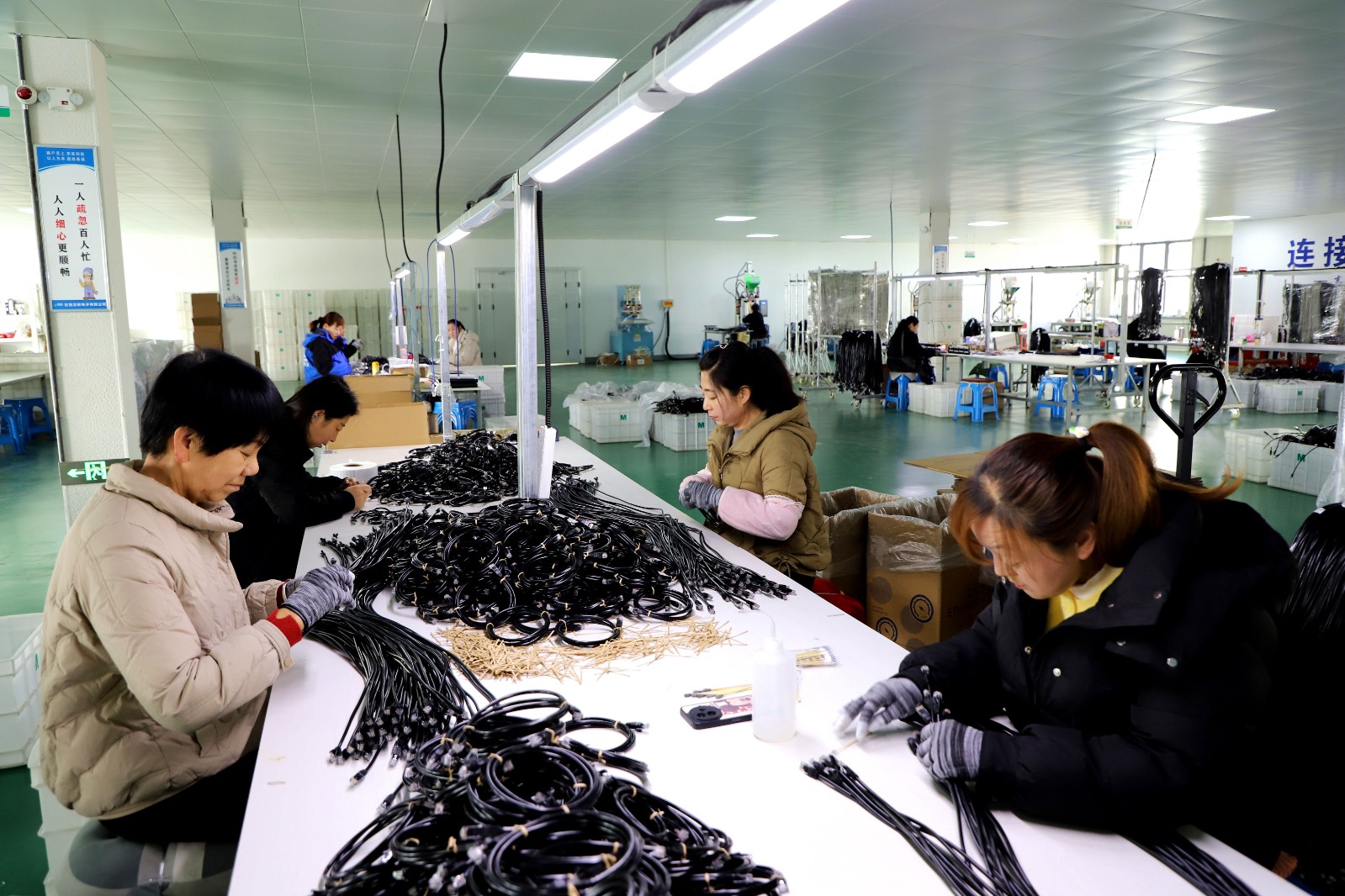 工人正在泛联电子有限公司高性能数据缆生产车间加工数据线