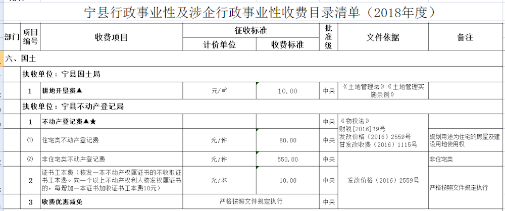 宁县行政事业性及涉企行政事业性收费目录清单(2018年度)---国土