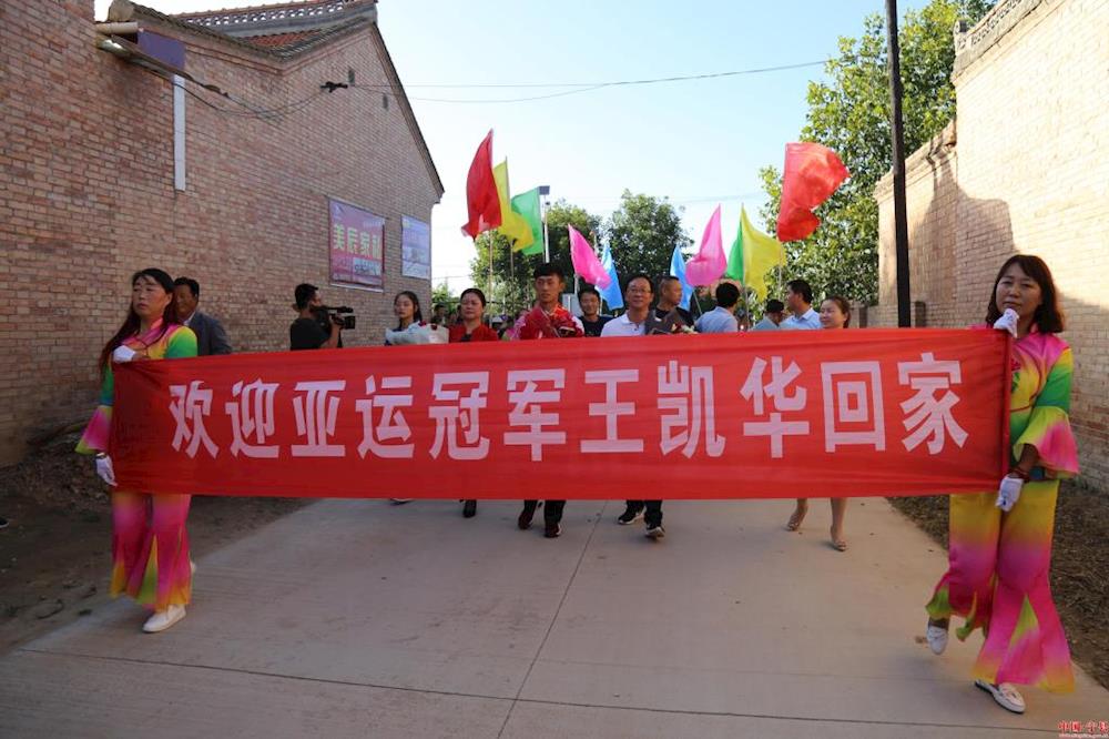 下午5点,王凯华回到家乡平子镇页沟村,乡邻为王凯华的凯旋归来举行了热烈的欢迎仪式,锣鼓声、鞭炮声、掌声、笑声响彻整个村庄,王凯华的亲戚、朋友及村民代表还为其送上鲜花、披红挂彩。