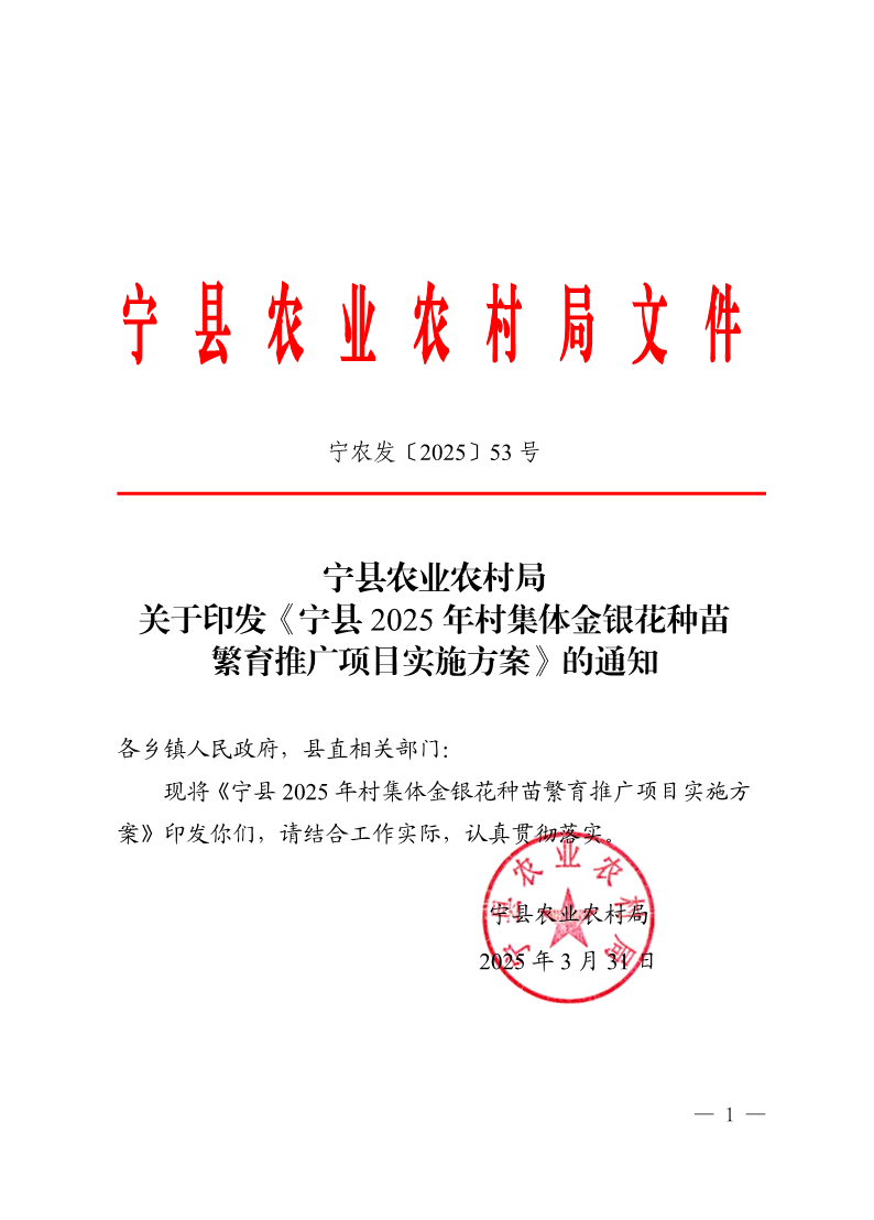 索引号: 621026nyncj000/20251118-00150 发布机构: 宁县农业农村局 生效日期: 2025-11-18 废止日期: 文 号: 宁农发〔2025〕53号 所属主题: 公示公告 宁县2025年村集体金银花种苗繁育推广项目实施方案 来源:宁县农业农村局 发布时间:2025-11-18 浏览次数: 次 【字体:小 大】 【打印正文】 分享到: 【字体:小 大】