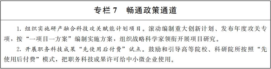 18.创新重大技术攻关和转化“一体化”组织形式。进一步优化省级科技计划组织形式,健全完善企业“出题”、政府“选题”、联合“答题”、市场“判题”攻关组织机制,成熟一项、启动一项,实施研产融合科技攻关赋能计划专项。建立重大攻关任务行政和技术“两总系统”指挥体系,实行技术指标和经济指标“双目标”考核机制,一体化推进关键技术攻关和重大成果产业化应用。2025年,实施研产融合科技攻关赋能计划项目10项左右。(责任单位:省科技厅、省工信厅、省财政厅、省政府国资委)