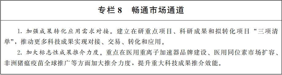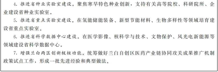 3.建设高能级创新平台。支持基于加速器的医用同位素药物研发平台、高端装备特种润滑与密封材料研发测试平台建设,争取国家重大科研基础设施在甘布局建设。争取在寒旱农业、核技术应用、动物疫苗、地球科学等优势特色领域,培育建设国家级创新平台。建立省级创新平台基地“白名单”制度,推进省级创新平台清理规范和优化整合。推进国家农业高新技术产业示范区和国家高新技术产业开发区创建工作,布局建设省级农业高新技术产业示范区。加强兰白两区创新政策改革试验,全面提升创新资源聚集、辐射和带动效应。(责任单位:省科技厅、省财政厅、省发展改革委、省工信厅、省农业农村厅、省卫生健康委、省政府国资委)