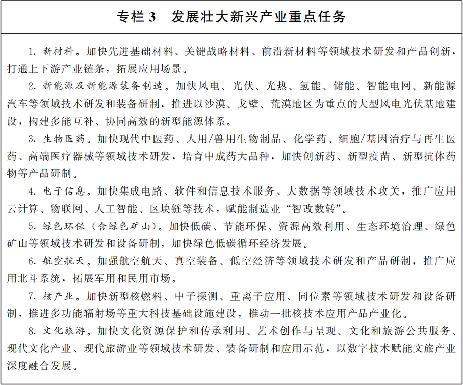 5.发展壮大新兴产业。聚焦新材料、新能源及新能源装备制造、生物医药、电子信息、绿色环保、航空航天、核产业、文化旅游等新兴产业,实施一批“延链”“补链”重大科技项目,突破和转化一批产业关键共性技术、瓶颈技术和前沿跨领域技术,提升酒嘉新能源装备制造、金昌新能源动力电池材料、庆阳多能互补等重点产业集群创新能力和竞争实力。(责任单位:省发展改革委、省工信厅、省科技厅、省委军民融合办、省卫生健康委、省药监局、省中医药管理局、省能源局、省文旅厅、省政府国资委)