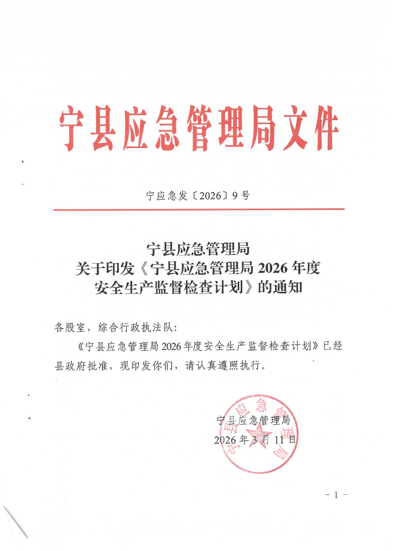 索引号: 621026yjj000/20260327-00005 发布机构: 宁县应急管理局 生效日期: 2026-03-27 废止日期: 文 号: 宁应急发〔2026〕9号 所属主题: 监督检查 宁县应急管理局2026年度安全生产监督检查计划 来源:宁县应急局 发布时间:2026-03-27 浏览次数: 次 【字体:小 大】 【打印正文】 分享到: 【字体:小 大】