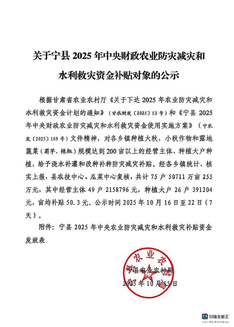 索引号: 621026nyncj000/20251016-00121 发布机构: 生效日期: 2025-10-16 废止日期: 文 号: 所属主题: 民生信息 关于宁县2025年中央财政农业防灾减灾和水利救灾资金补贴对象的公示 来源: 发布时间:2025-10-16 浏览次数: 次 【字体:小 大】 【打印正文】 分享到: 【字体:小 大】