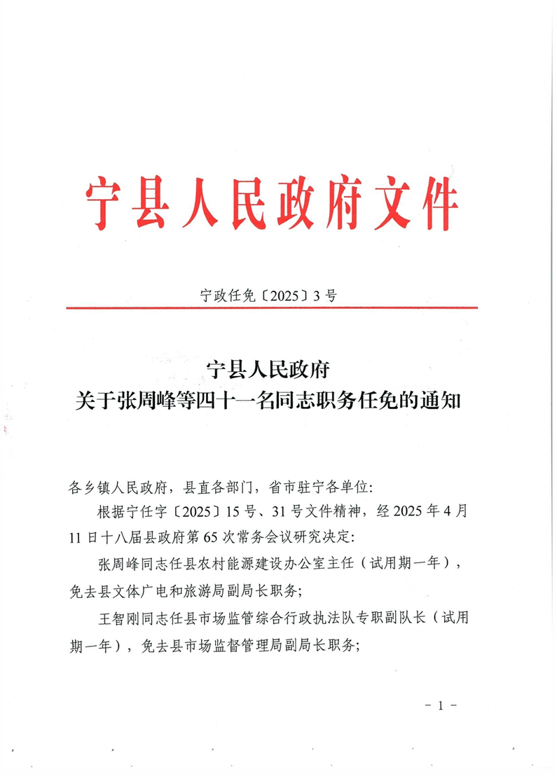 索引号: 621026xzf000/20251125-00064 发布机构: 生效日期: 2025-04-12 废止日期: 文 号: 宁政任免〔2025〕3号 所属主题: 人事信息 宁政任免〔2025〕3号 关于张周峰等四十一名同志职务任免的通知 来源:宁县人民政府 发布时间:2025-04-12 浏览次数: 次 【字体:小 大】 【打印正文】 分享到: 【字体:小 大】