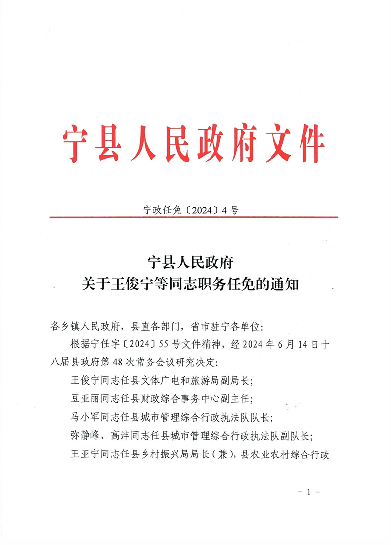 索引号: 621026xzf000/20251125-00072 发布机构: 生效日期: 2024-06-15 废止日期: 文 号: 宁政任免〔2024〕4号 所属主题: 人事信息 宁政任免〔2024〕4号 关于王俊宁等同志职务任免的通知 来源:宁县人民政府 发布时间:2024-06-15 浏览次数: 次 【字体:小 大】 【打印正文】 分享到: 【字体:小 大】