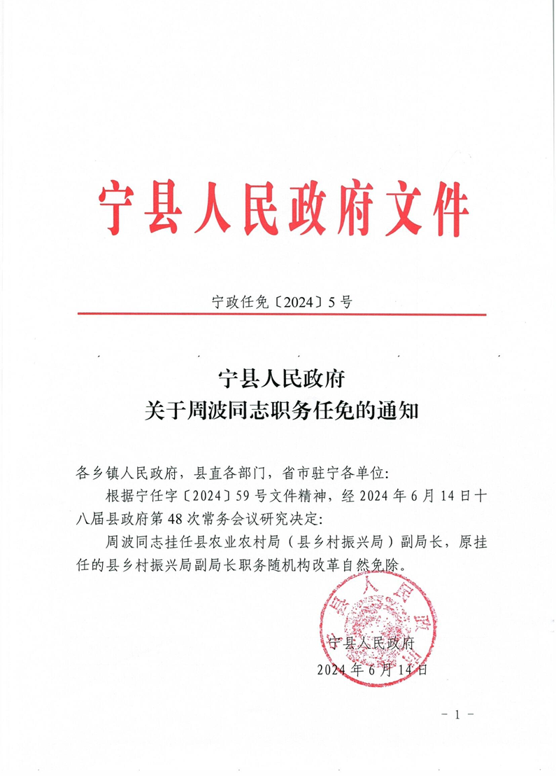 索引号: 621026xzf000/20251125-00073 发布机构: 生效日期: 2024-06-15 废止日期: 文 号: 宁政任免〔2024〕5号 所属主题: 人事信息 宁政任免〔2024〕5号 关于周波同志职务任免的通知 来源:宁县人民政府 发布时间:2024-06-15 浏览次数: 次 【字体:小 大】 【打印正文】 分享到: 【字体:小 大】