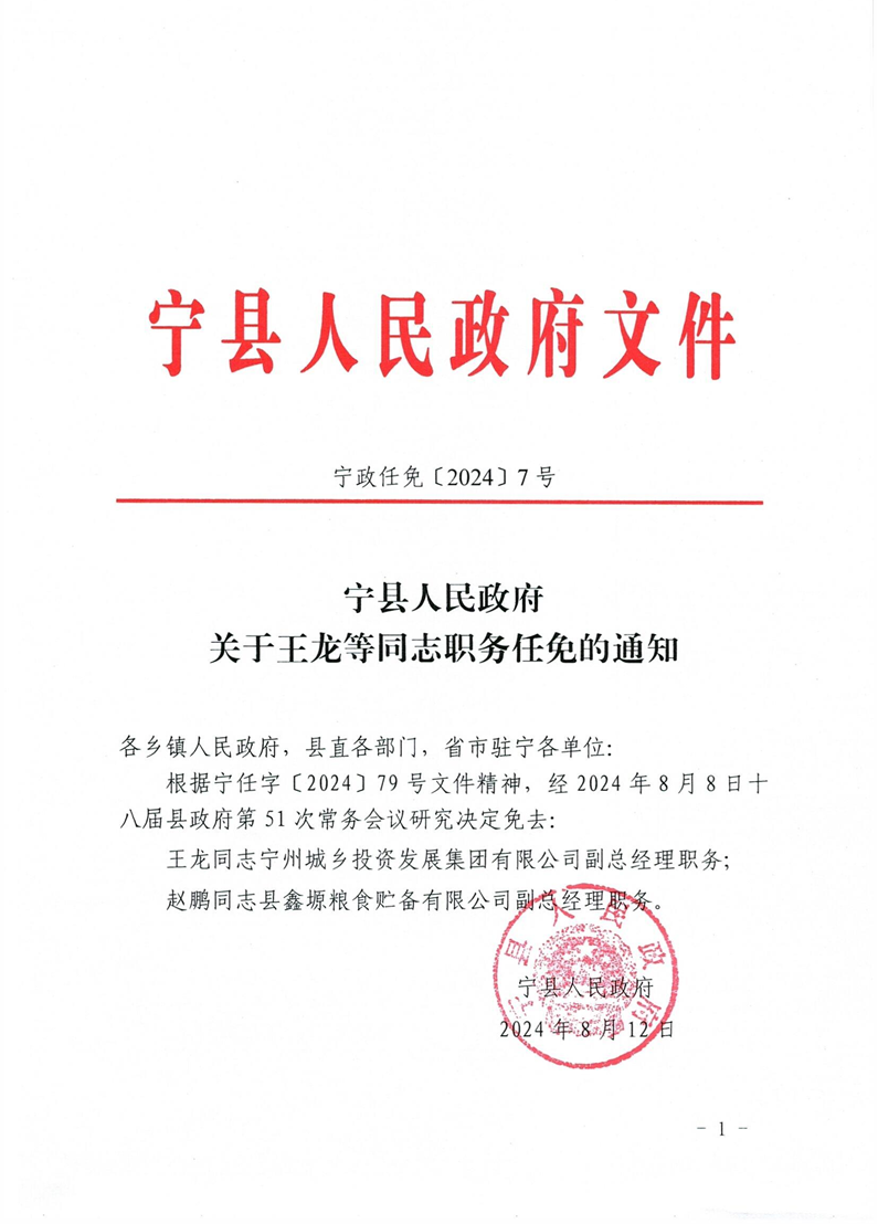 索引号: 621026xzf000/20251125-00075 发布机构: 生效日期: 2024-08-13 废止日期: 文 号: 宁政任免〔2024〕7号 所属主题: 人事信息 宁政任免〔2024〕7号 关于王龙等同志职务任免的通知 来源:宁县人民政府 发布时间:2024-08-13 浏览次数: 次 【字体:小 大】 【打印正文】 分享到: 【字体:小 大】