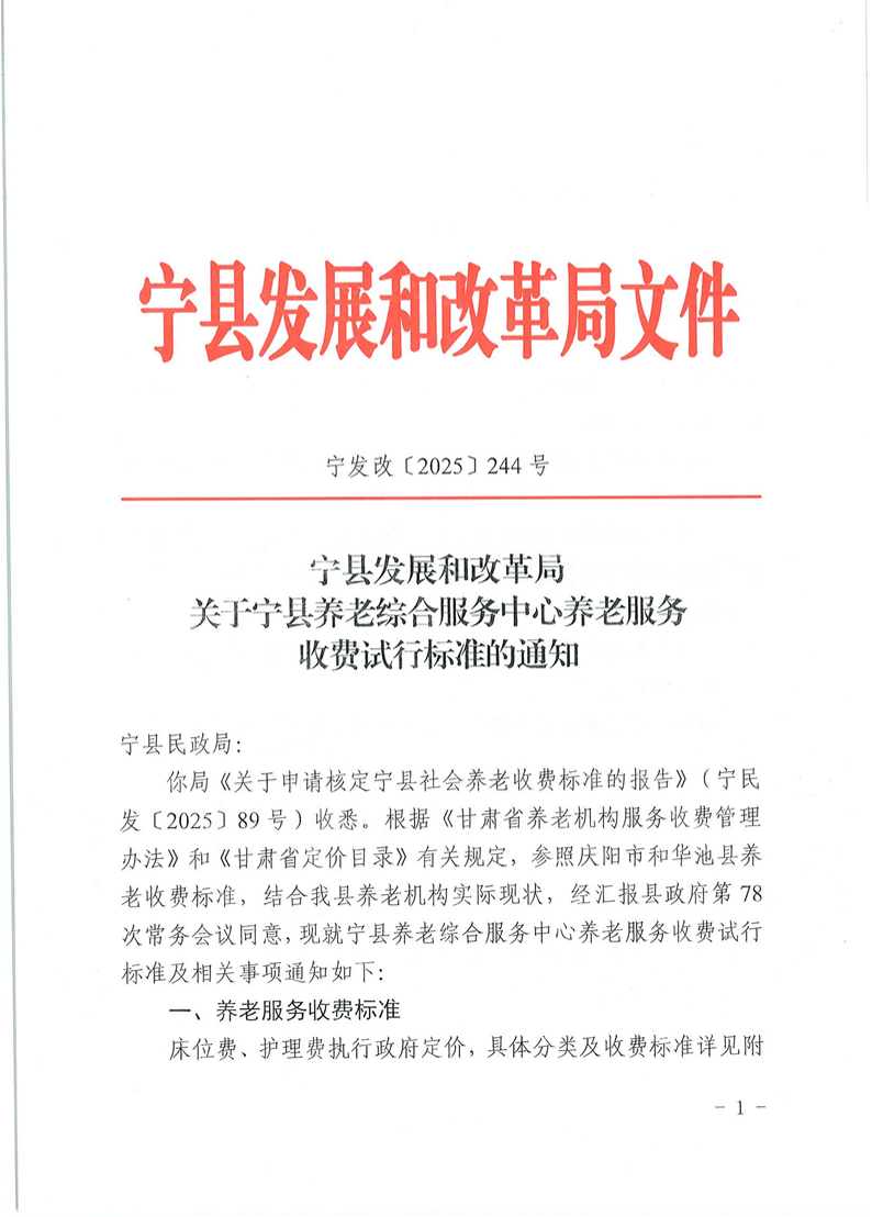 索引号: 621026fgj2000/20251224-00020 发布机构: 宁县发展和改革局 生效日期: 2025-12-24 废止日期: 2028-01-01 文 号: 宁发改〔2025〕244号 所属主题: 行政事业性收费 宁县养老综合服务中心养老服务收费试行标准的通知 来源:宁县发展和改革局 发布时间:2025-12-24 浏览次数: 次 【字体:小 大】 【打印正文】 分享到: 【字体:小 大】
