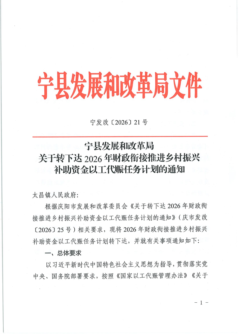 索引号: 621026fgj2000/20260205-00004 发布机构: 生效日期: 2026-02-05 废止日期: 文 号: 所属主题: 重大项目建设 关于转下达2026年财政衔接推进乡村振兴补助资金以工代赈任务计划的通知 来源:宁县发改局 发布时间:2026-02-05 浏览次数: 次 【字体:小 大】 【打印正文】 分享到: 【字体:小 大】