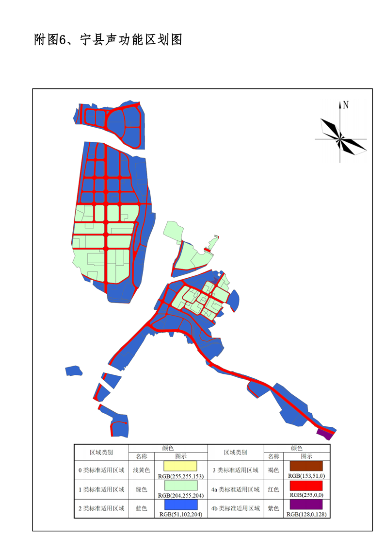 (注:相关区域具体边界可参考《方案》附件《宁县声环境功能区划图》,各类区域图示颜色:1类区绿色、2类区蓝色、4a类区红色、4b类区紫色。)