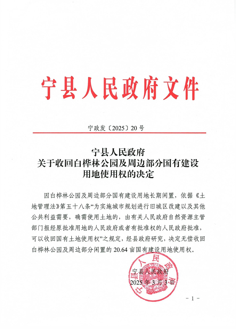 索引号: 621026xzf000/20251126-00085 发布机构: 宁县人民政府 生效日期: 2025-03-04 废止日期: 文 号: 宁政发〔2025〕20号 所属主题: 县政府文件 宁县人民政府关于收回白桦林公园及周边部分国有建设用地使用权的决定 来源:宁县人民政府 发布时间:2025-03-04 浏览次数: 次 【字体:小 大】 【打印正文】 分享到: 【字体:小 大】
