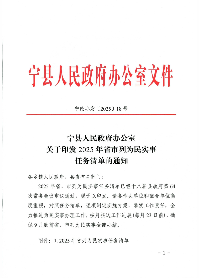 索引号: 621026xzf000/20251201-00097 发布机构: 生效日期: 2025-04-02 废止日期: 文 号: 宁政办发〔2025〕18号 所属主题: 政府办文件 宁县人民政府办公室关于印发2025年省市列为民实事任务清单的通知 来源:宁县人民政府办公室 发布时间:2025-04-02 浏览次数: 次 【字体:小 大】 【打印正文】 分享到: 【字体:小 大】